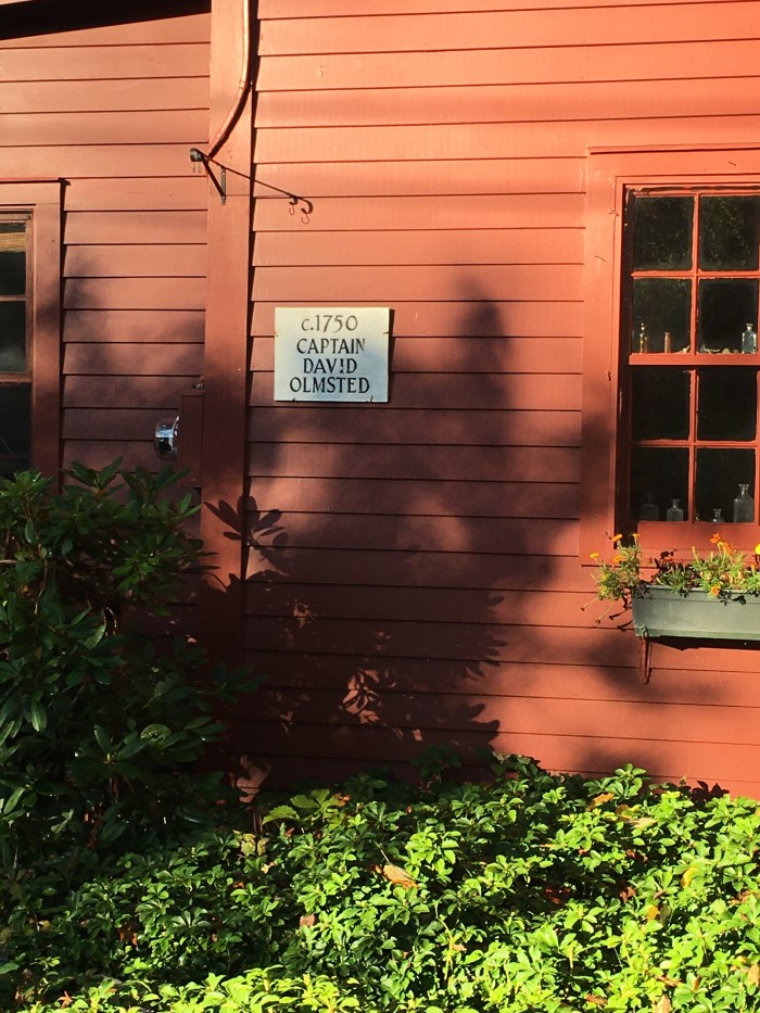 As far as I can tell, the David Olmsted of this house was born in 1748 in Ridgefield, and died in 1815 in Jamesville, NY.  He came from a long line of Olmsteds who came to the New World from Essex, England in the 1600s – at some point, one of them helped found Ridgefield. I also believe our David Olmsted was indeed distantly related to Frederick Law Olmsted as that Olmsted was also born in Connecticut and was also descended from Olmsteds who came here from Essex, England in the 1600s.