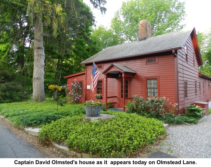 Ridgefield Town Historians have, over the years, confirmed that the house I’ve repeatedly run by, at 91 Olmsted Lane, was indeed owned by Captain David Olmsted of Revolutionary War (and Red Petticoat outrage) fame.  At least, they put up a sign to that effect in 1976 during the Bicentennial celebration.