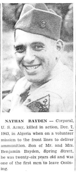 Nathan Bayden was born in Ossining on July 21, 1918. His parents, Benjamin and Fannie, were born in either Poland or Russia (hard to know back then as the borders kept shifting.) The family was Jewish.