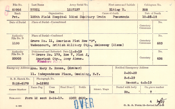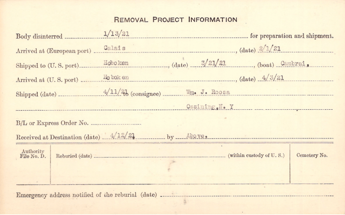 In 1921, Private Roosa’s remains were exhumed and transported back to the States on the USS Cambrai, leaving Antwerp, Belgium on March 21, and arriving in Hoboken, NJ on April 3. (Ossining’s Sergeant Joseph De Barbiery arrived in Hoboken three months later, in July, 1921.)