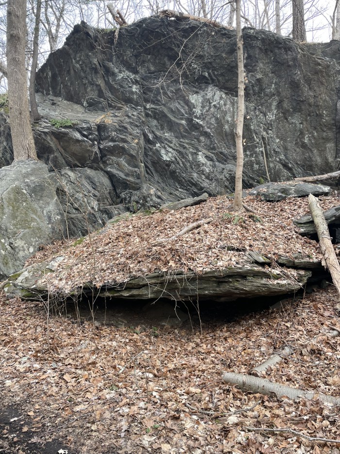 The shelter is formed by a great monolith torn by glacial action from the cliff of Fordham gneiss above it. This Archaean ridge extends in nearly a due north and south direction and falls sharply to the east to the Pocantico River a hundred feet below.