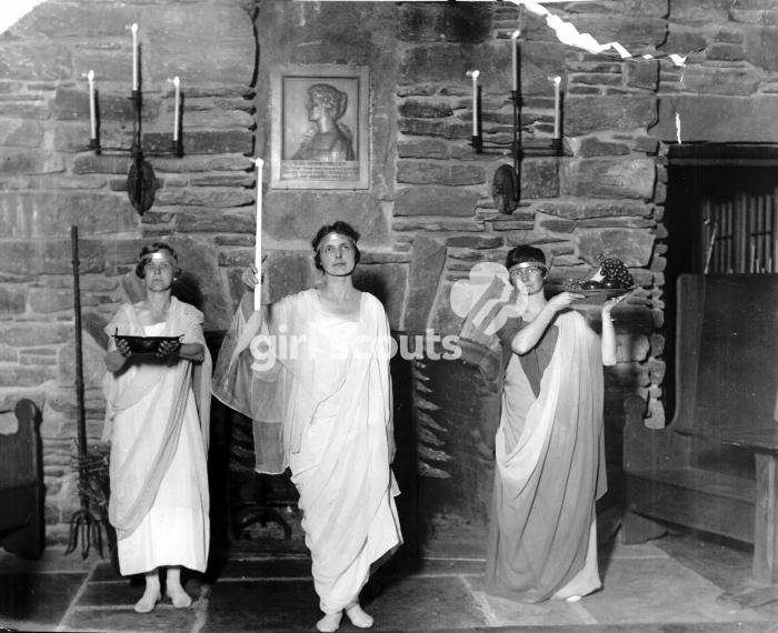 Dedication of Camp Edith Macy in Great Hall, 1926. Left to to Right: “Warmth”, Ruth Mitchell; “Light”, Oleda Schrottky; “Food”, Elsa G. Beeker. Plaque of Edith Macy on the wall behind them Photo credit the Girl Scouts Archives
