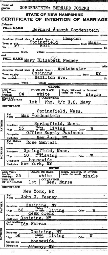 Ensign Feeney’s initial posting is still unclear, but in May of 1942 she married Bernard Joseph Gordenstein in Hillsborough, New Hampshire. He was also in the Navy, serving as a pharmacist. (This bit of information came as something of a surprise to the members of the Feeney family consulted for this exhibit. This might explain why the road is named Feeney and not Gordenstein.)